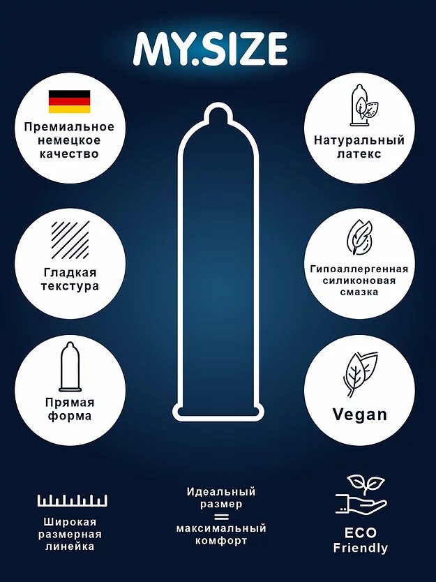 MY SIZE 64 размера обеспечивает отличное прилегание и адаптацию к анатомической форме за счет использования латекса премиум-класса, который не содержит вредных для человеческого организма и окружающей среды веществ, также в нем не содержатся продукты животного происхождения (белок казеин), которые присутствуют в составе большинства торговых марок презервативов и он подходит для использования веганами и людьми с религиозными ограничениями.